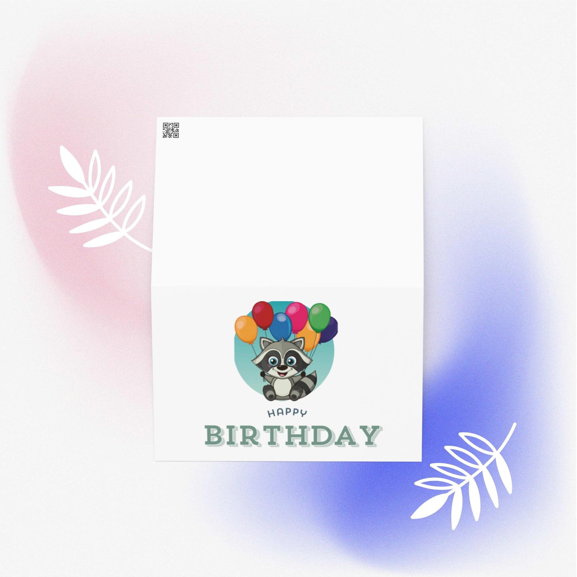 Celebrate birthdays with a touch of whimsy by using our "Raccoon with Balloons" birthday card. This delightful card features an adorable raccoon holding many colorful balloons, creating the perfect way to send birthday wishes. The inside is blank and ready for your personalized message.